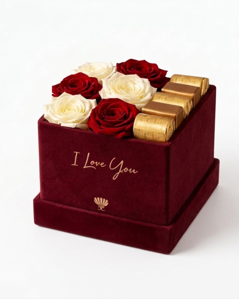 Luxe absolu dans un coffret velours : le duo irrésistible de roses éternelles et de chocolats fins dorés.