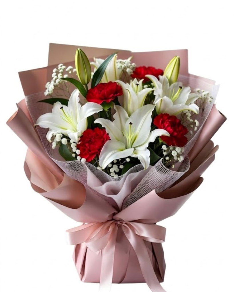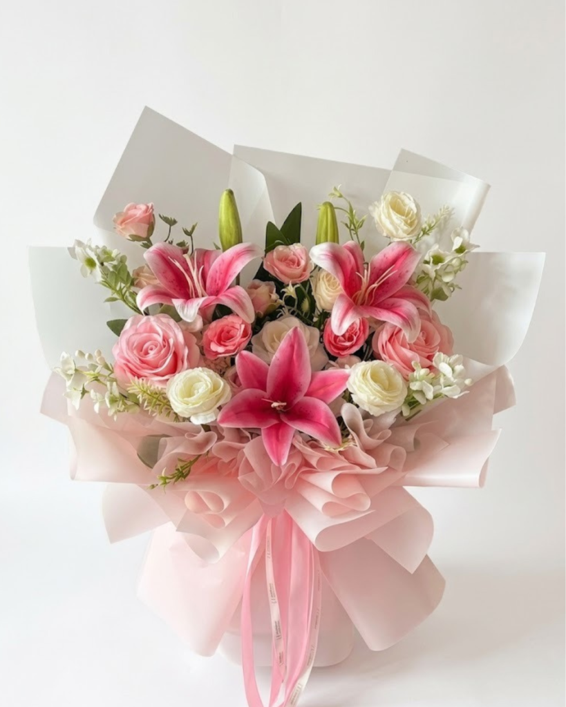 Un souffle joyeux et lumineux où la noblesse du lys rose rencontre la tendresse des roses.