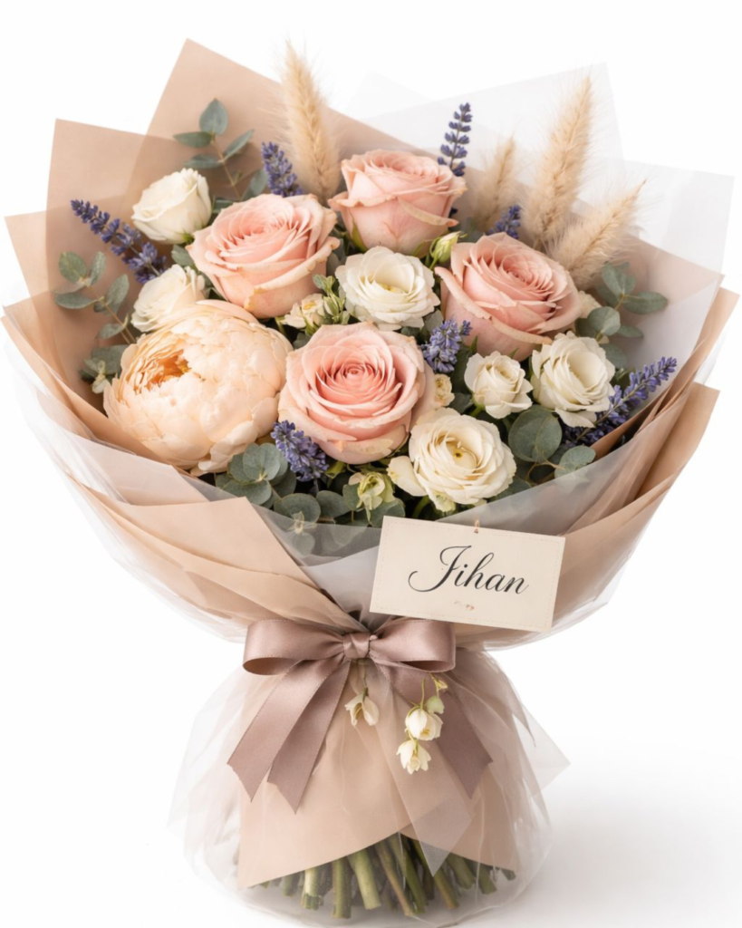 L'élégance du sur-mesure. Un bouquet bohème-chic personnalisé avec le nom de l'être cher.