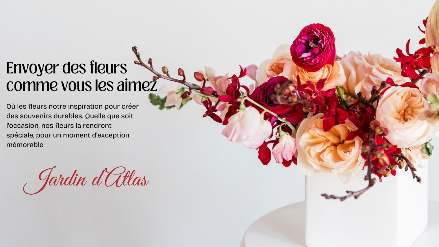 Chez Jardin d’Atlas, nous proposons une large gamme de bouquets adaptés à toutes les occasions, avec une livraison rapide et soignée directement à votre porte, la possibilité de personnaliser chaque création selon vos envies, et un engagement constant pour l’esthétique, le raffinement et la satisfaction de nos clients.